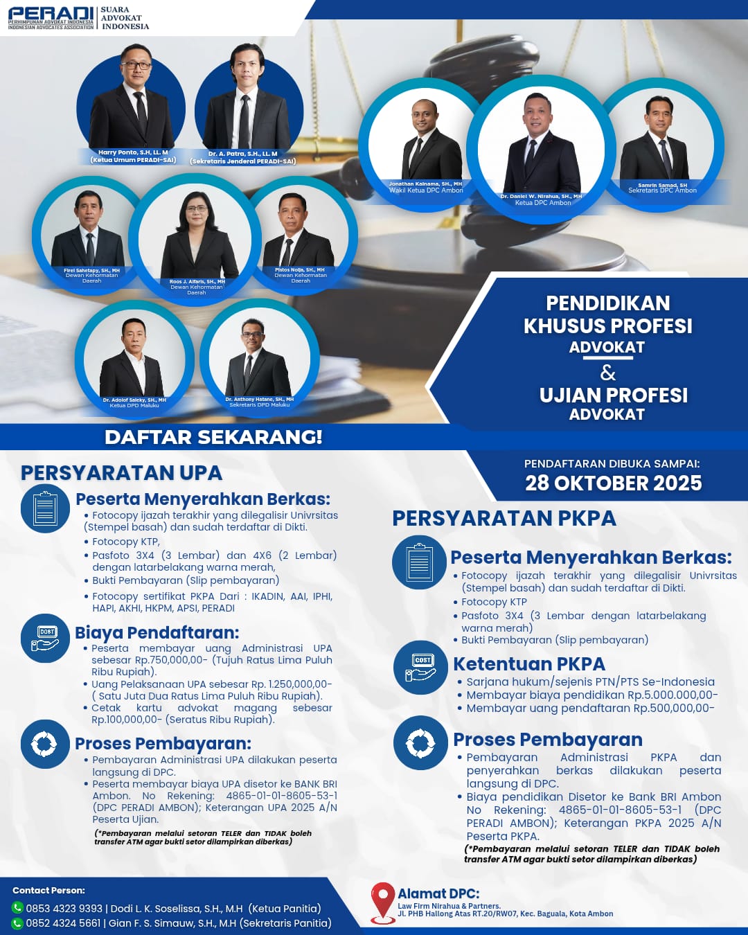 PERADI Suara Advokat Indonesia (DPC Ambon) membuka pendaftaran Pendidikan Khusus Profesi Advokat (PKPA) dan Ujian Profesi Advokat (UPA) bagi lulusan sarjana hukum yang ingin berkarier sebagai advokat profesional.