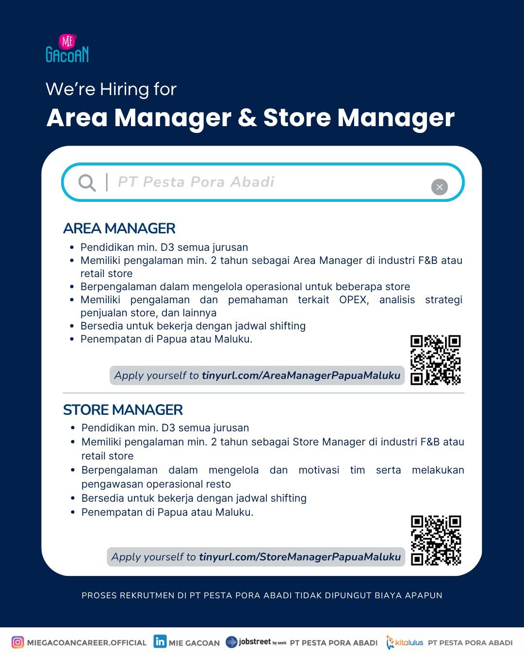 PT Pesta Pora Abadi (Mie Gacoan) membuka peluang karier bagi kamu yang berpengalaman di dunia F&B dan retail! Saat ini kami mencari Area Manager dan Store Manager untuk bergabung dan berkembang bersama tim kami di wilayah Papua dan Maluku.