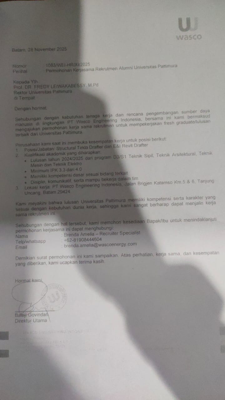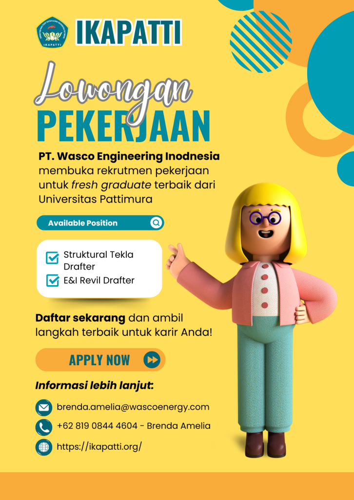 Sehubungan dengan kebutuhan kerja dan rencana pengembangan Sumber Daya Manusia di lingkungan PT. Wasco Engineering Indonesia, maka PT. Wasco Engineering Indonesia membuka kesempatan kerja bagi fresh graduate atau lulusan terbaik Universitas Pattimura untuk posisi atau jabatan sebagai Structural Tekla Drafter dan E&I Revil Drafter.