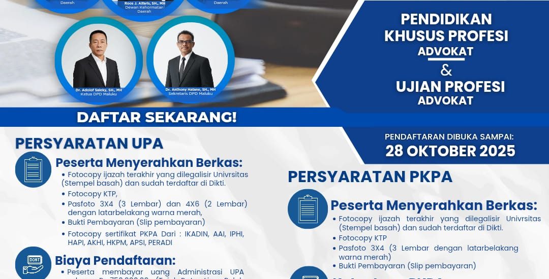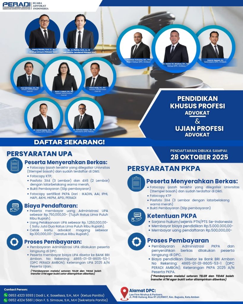 Dewan Pimpinan Cabang Perhimpunan Advokat Indonesia (PERADI) Suara Advokat Indonesia – DPC Ambon membuka pendaftaran Pendidikan Khusus Profesi Advokat (PKPA) dan Ujian Profesi Advokat (UPA) bagi lulusan sarjana hukum yang ingin menapaki karier profesional sebagai advokat.